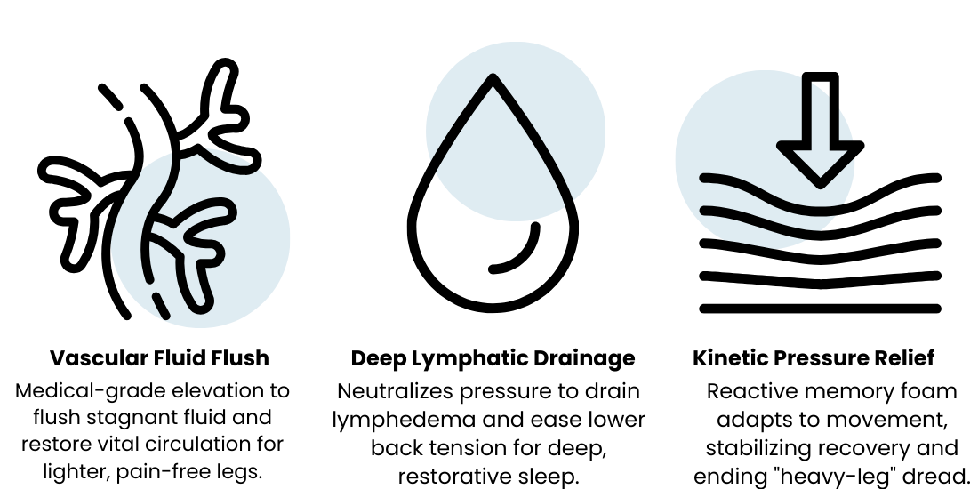 Featuring our exclusive Lymph-Flow Drainage System™, it uses a precision-calibrated angle to flush out swelling, improve circulation, and decompress your spine. Join thousands who have traded heavy legs for expert-validated relief and total nighttime recovery.